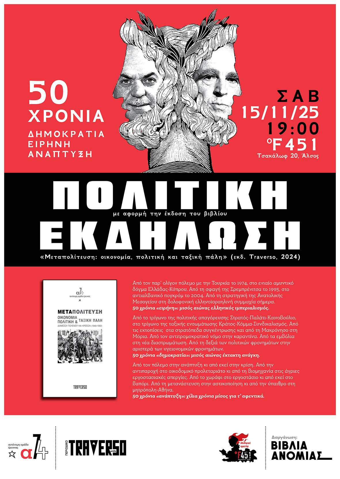 Σάββατο 15/11/2025, 19:00, στο ελευθεριακό εργαστήρι F451 (Τσακάλωφ 20, Άλσος)